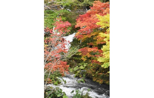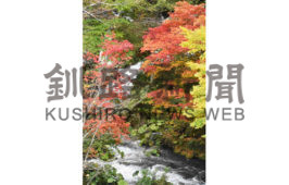 [写真/見頃を迎えている阿寒湖温泉周辺の紅葉(10日午前10時30分ごろ、滝見橋) ]