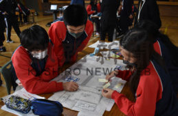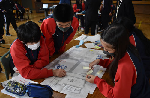 [写真/ゲームを通して避難所運営を疑似体験する生徒 ]
