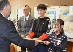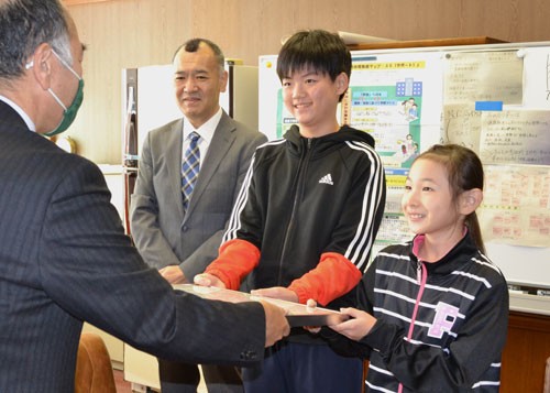 [写真/賞状を受ける井出さんと和田君(右から) ]