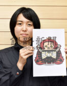 [写真/コロナ退散のシンボルとなるマスコットロゴと善明さん ]