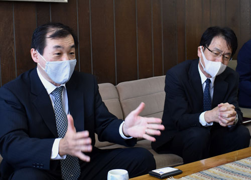 [写真/来釧あいさつで本社を訪れた谷口局長(左)と武藤所長 ]