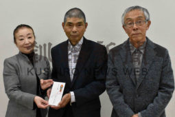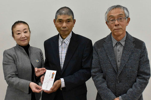 [写真/金安副会長から協力費を受け取った吉田代表と大島さん(左から) ]