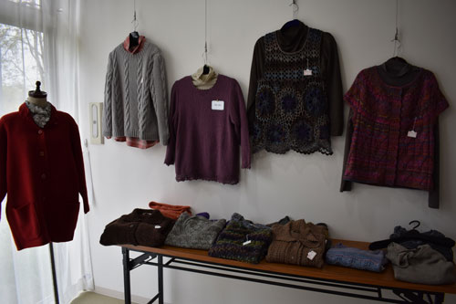 [写真/ヒルズギャラリーで開かれている「あったかニット編物教室作品展」 ]