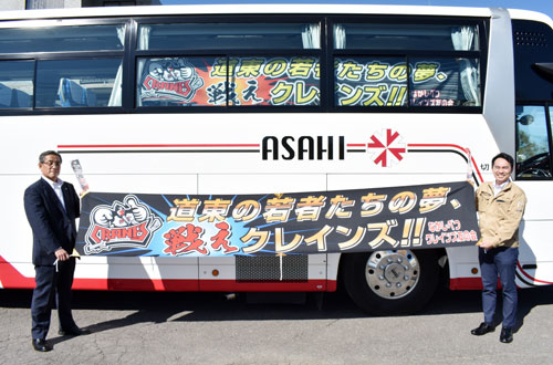 [写真/横断幕を手に観戦を呼び掛けるなかしべつクレインズ友の会 ]