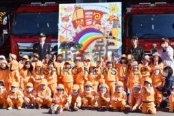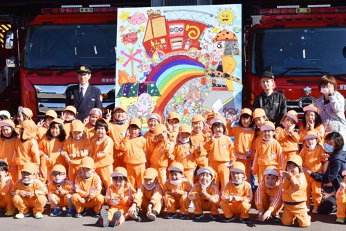 [写真/大型の防火看板を囲む睦の園の園児とサトリーさん(最後列右から2人目) ]