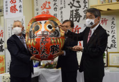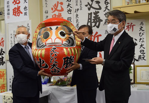 [写真/4選を祝してだるまに目を入れる蝦名氏(右)=18日午後10時20分ごろ、大町 ]
