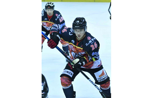 [写真/大卒ルーキー、伸び盛りのFW齊藤(手前)。前主将でラインメイトのFW上野から多くを学ぶ ]