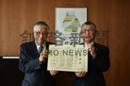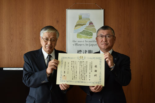 [写真/感謝状を手に小針社長(右)と金澤町長 ]