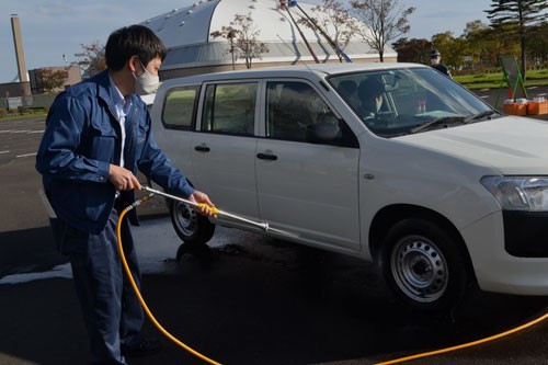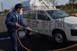 [写真/伝染病発生時の想定訓練で車両を消毒する参加者 ]