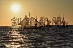 [写真/朝日を浴びてホッカイシマエビ漁を行う打瀬舟(24日午前6時5分ごろ) ]