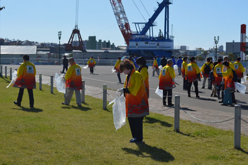 [写真/そろいの法被でごみ拾いを行う参加者たち ]