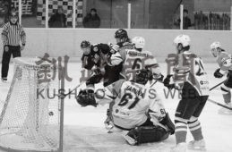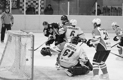[写真/第2ピリオド3分、日本製紙のDF伊藤賢(左奥)が鮮やかな同点ゴールを決める ]