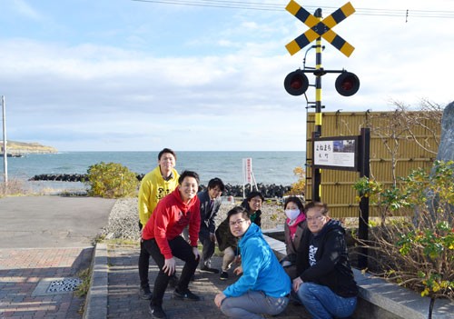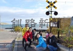 [写真/再現した踏切警報機とくしろ元町青年団のメンバー ]