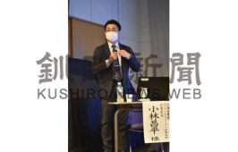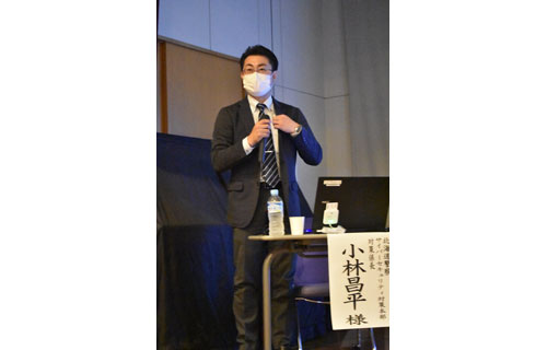 [写真/サイバー空間における脅威と対策について講話する小林係長 ]