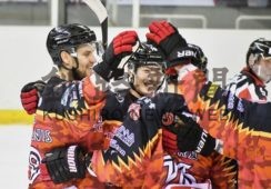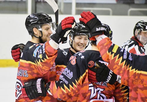 [写真/【ひがし北海道―東北】第2ピリオド9分、チーム合流初戦でゴールを決め、祝福を受けるFWゾルマニス(左端) ]