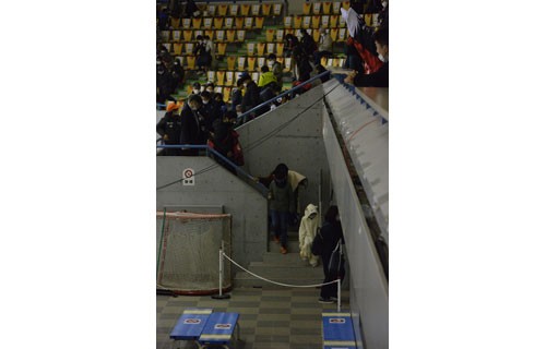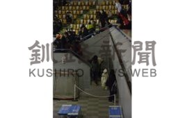 [写真/「一方通行」に従って場内を移動する来場者(ひがし北海道クレインズアイスアリーナ) ]