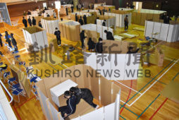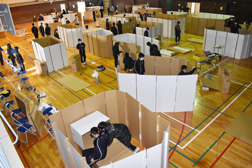 [写真/㊤避難所開設訓練で段ボールベッドと間仕切りを設置㊦避難所受付訓練も行った ]