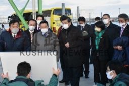 [写真/第2埠頭で説明を聞く赤羽氏(左端) ]