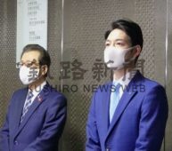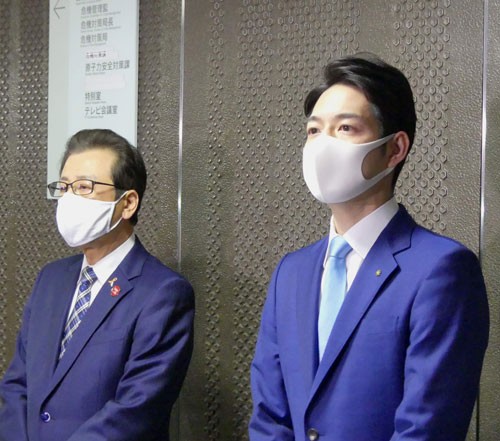 [写真/新型コロナウイルス対策で意見交換後、取材に応じる鈴木知事(右)と秋元札幌市長 ]
