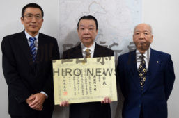 [写真/伝達式に臨んだ高垣所長、山田さん、須藤支部長(左から) ]