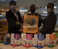 [写真/蟻戸館長(左)に図書を手渡す中畑会長(右) ]