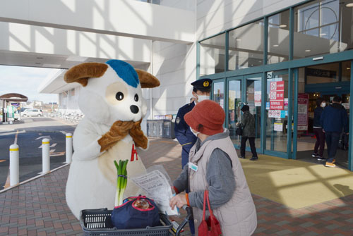 [写真/買い物客に児童虐待防止を訴えるほくとくんら ]