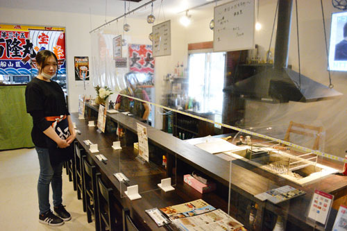 [写真/大漁旗、いろりカウンターがあずましい「仙鳳趾牡蠣御殿」。テーブル席もある ]