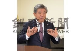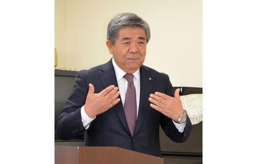 [写真/ふるさと納税の取り組みについて説明する棚野町長 ]