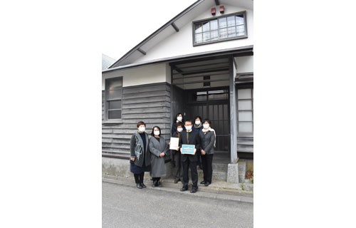 [写真/旧五十嵐家の玄関前で登録証とプレートを手にする保存会のメンバーと関係者 ]