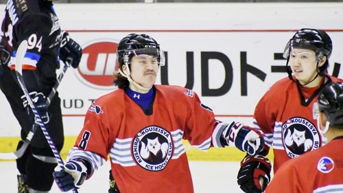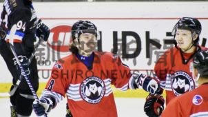 [写真/【釧路厚生社―札幌クラブ】第2ピリオド5分、ゴールを決め祝福を受ける釧路厚生社のFW川口(左) ]