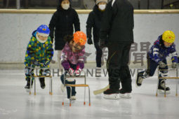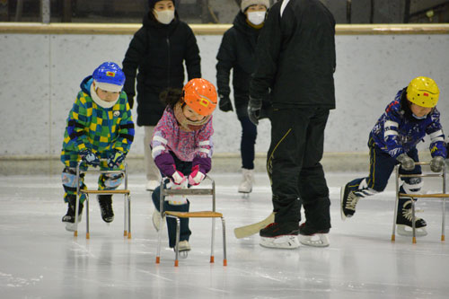 [写真/補助椅子を使って氷上を疾駆する園児ら ]