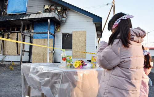 [写真/火災現場前に設置された献花台に花やお菓子、ジュースを備え手を合わせる子供たち(4日午後3時15分ごろ) ]