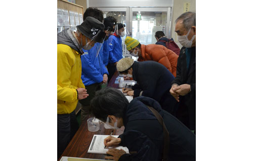 [写真/和商市場で日本製紙の事業撤退の再考を求める署名に協力する買い物客ら ]