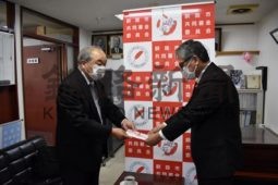 [写真/太田常務理事に寄付金を手渡す加藤会長(左) ]