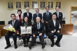 [写真/受賞した田中さん(前列左から2番目)と湊屋町長(前列右)ら出席者 ]