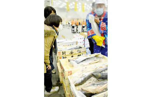 [写真/ビニールシートの間仕切りがある中、ずらりと並んだ海産物を品定めする来場者 ]