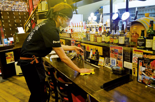 [写真/感染防止パネルを設置し、アイシールドやマスクを着用して客席の準備をするスタッフ(釧路食堂末広店) ]