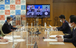 [写真/JR北海道の支援問題ついてオンラインで結び意見交換する上原局長、鈴木知事、島田社長(左から) ]