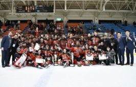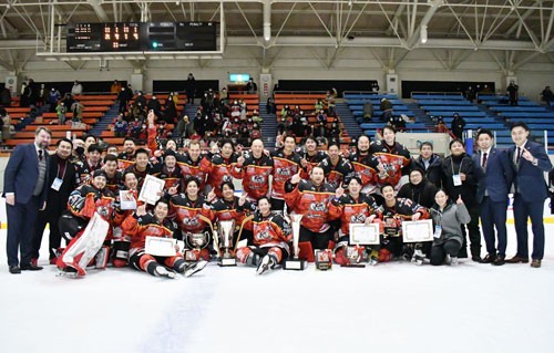 [写真/全国から八戸に駆け付けたファンと一緒に日本一を喜ぶひがし北海道クレインズ(13日、テクノルアイスパーク八戸) ]