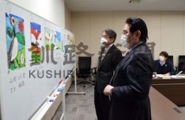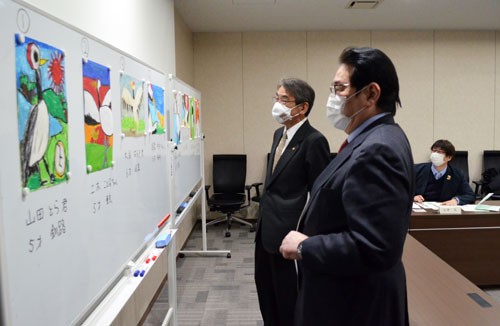 [写真/審査する8作品を見る蝦名大也市長(左)と日本航空の植木義晴会長 ]