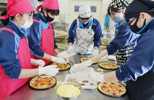 [写真/地場産食材を使ったピザ作りに励む生徒 ]