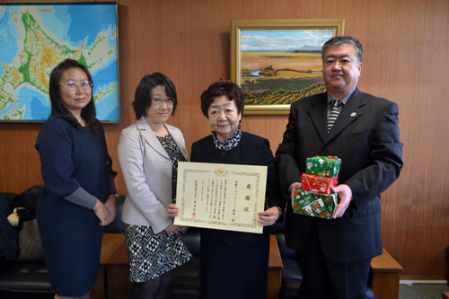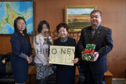 [写真/釧路刑務支所の菅原支所長(右)に図書を贈った卯月会長(右から2人目)ら ]
