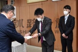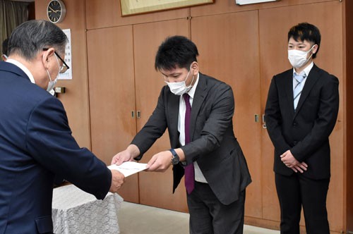 [写真/介護人材確保の提言書を渡す周田座長(中央) ]