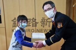 [写真/脇坂分団長から図書を受け取る町田図書委員長(左) ]
