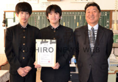 [写真/右から齊藤参事、上野委員長と徳野生徒会長 ]