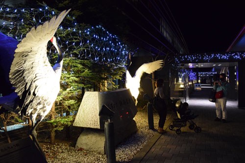 [写真/タンチョウヅルのモニュメント前で記念撮影する旅行者 ]