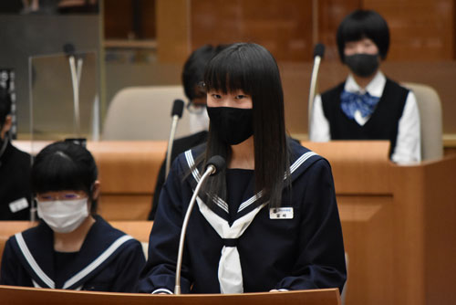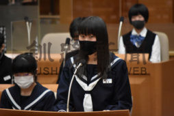 [写真/議場で理事者に質問する中学生 ]