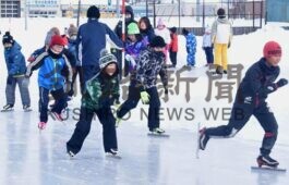 [写真/スケート学習で氷の感触を楽しむ虹別小の児童 ]