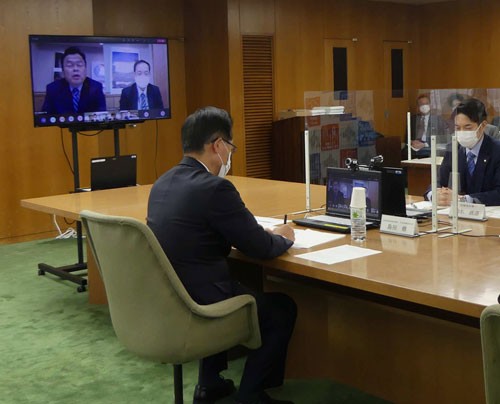 [写真/ウェブで結んで行われたJR支援策をめぐる関係者会議。モニター左側の赤羽国交相の発言を聞く、島田社長と鈴木知事(右) ]
