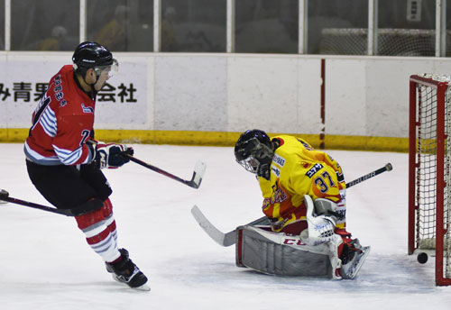 [写真/【釧路厚生社―釧路東部ブレイズ】第1ピリオド15分、相手GKを崩して、ゴールを決める釧路厚生社のFW木戸 ]